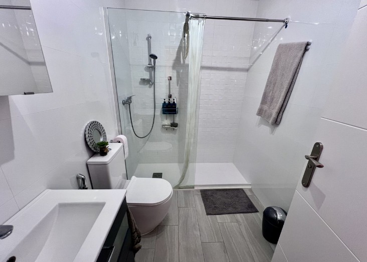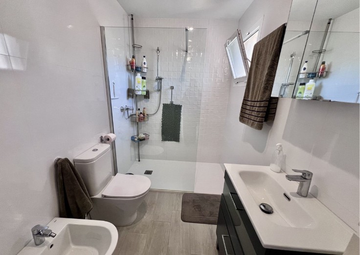 En la planta superior, los tres dormitorios dobles son muy espaciosos. El dormitorio principal dispone de baño privado con ducha y terraza propia con vistas al jardín y a la piscina comunitaria. Los otros dos dormitorios comparten un baño familiar. Todos los dormitorios cuentan con amplio espacio de almacenamiento y son muy luminosos.