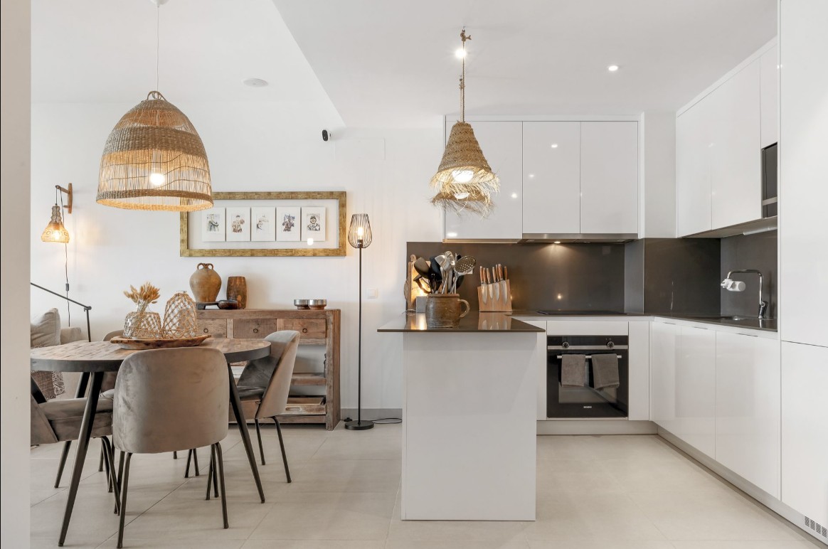 El interior cuenta con un luminoso salón-comedor de planta abierta y una cocina totalmente equipada con electrodomésticos Siemens, lo que crea una fluidez de espacio y estilo. El dormitorio principal con baño en suite y el dormitorio de invitados con baño independiente ofrecen comodidad y funcionalidad.