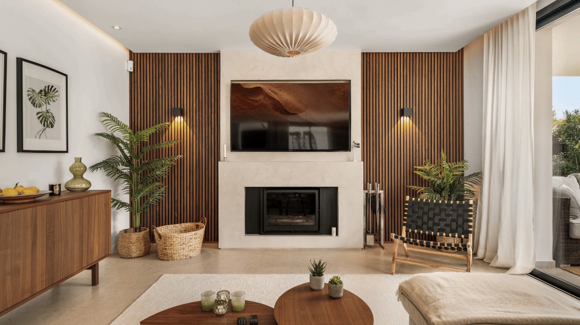 Células solares que le dan a la villa un espacio habitable energéticamente eficiente, chimenea en la sala de estar para una sensación acogedora y una calidez natural.