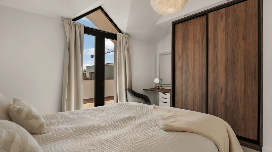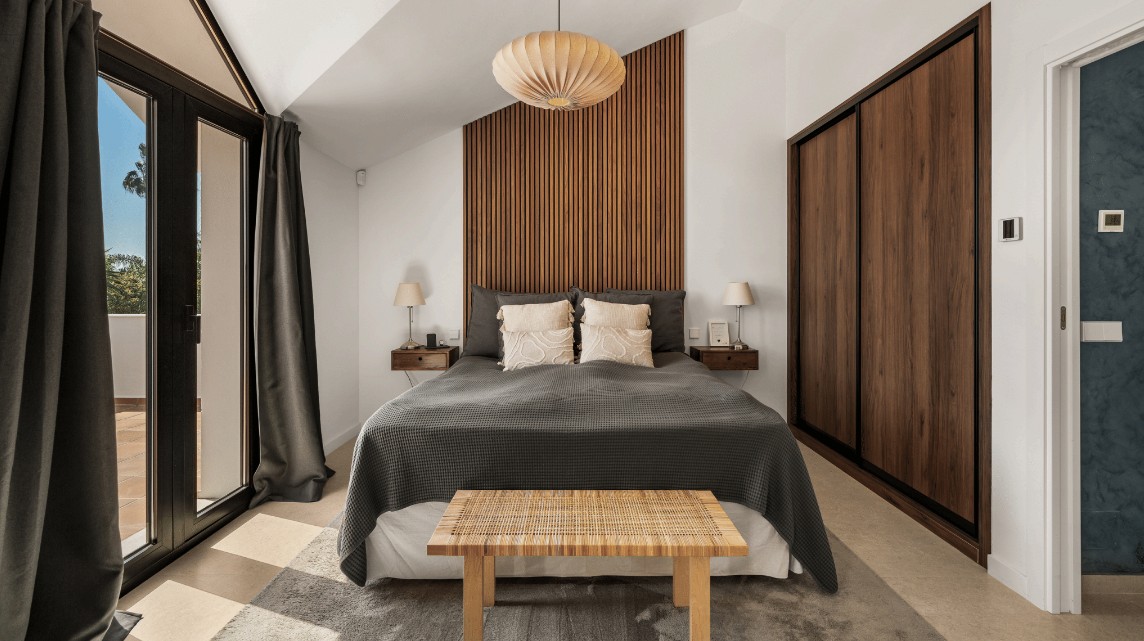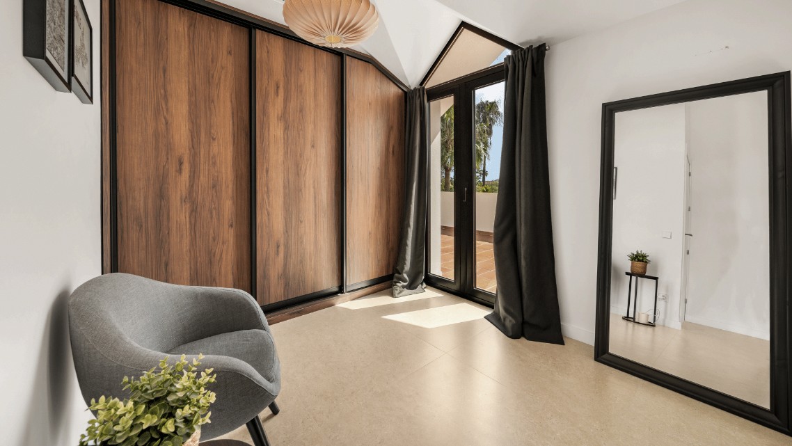 Planta superior con dos dormitorios en suite y un balcón al que se puede acceder desde ambas habitaciones con una hermosa vista donde se puede sentir La Concha y el campo de golf Los Naranjos.