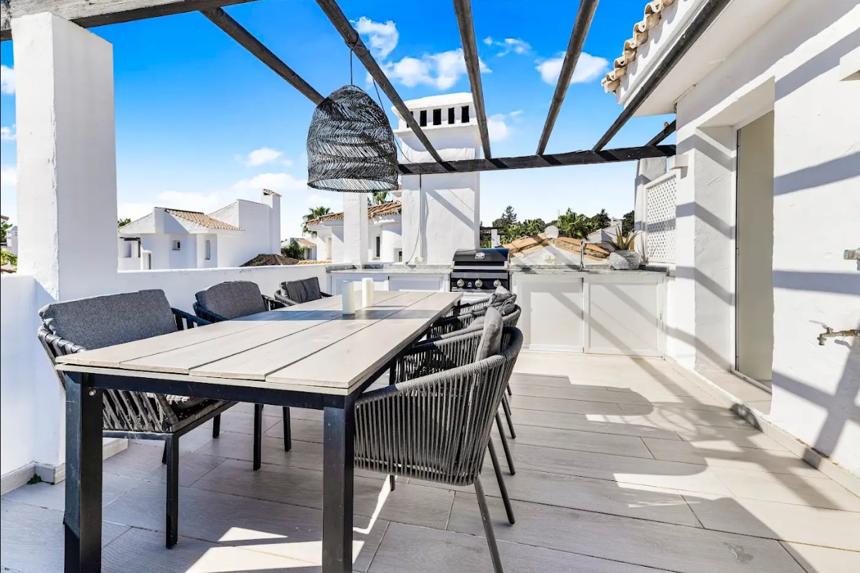Ascendiendo al nivel superior, se encuentra la joya corona de la propiedad: una magnífica terraza en la azotea con un BBQ incorporado y zona de cocina, mesa de comedor y un acogedor espacio de asientos.