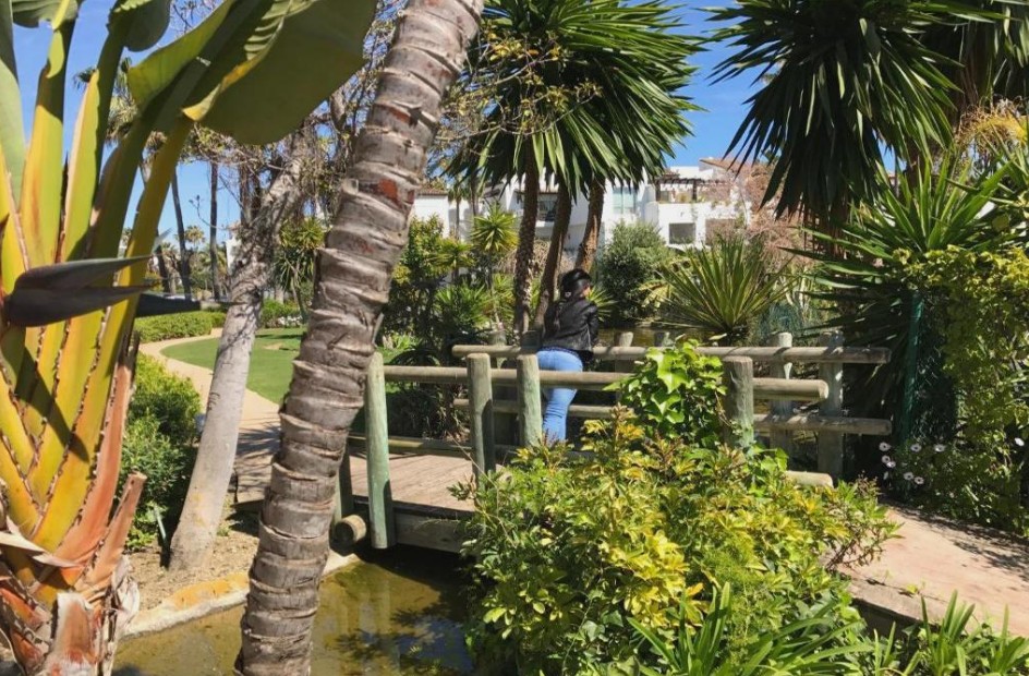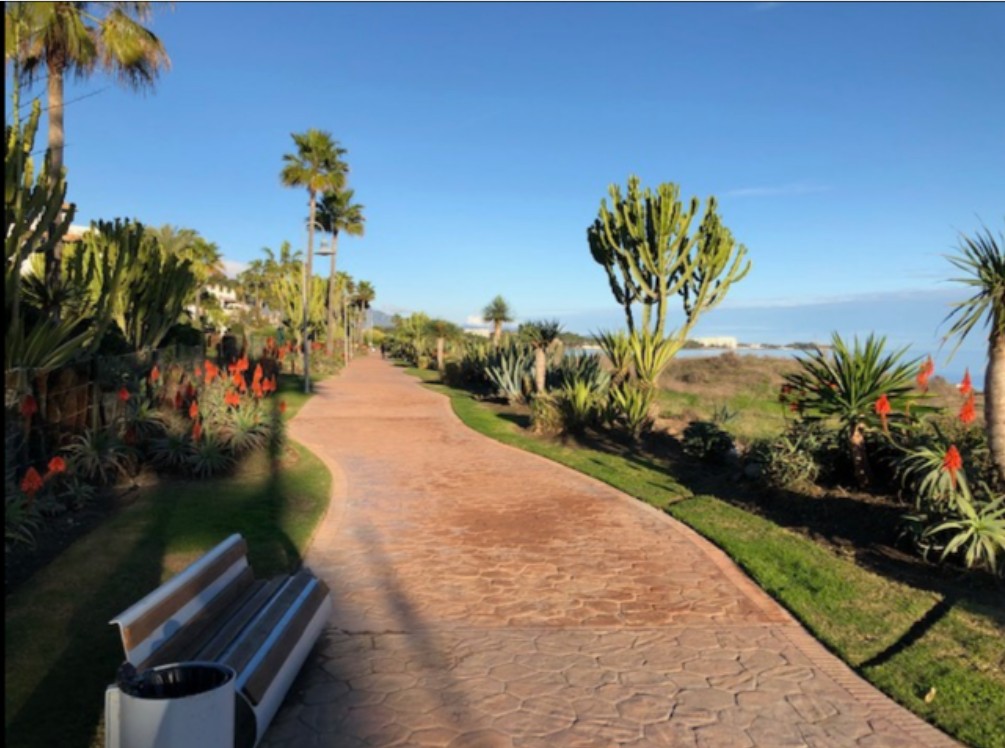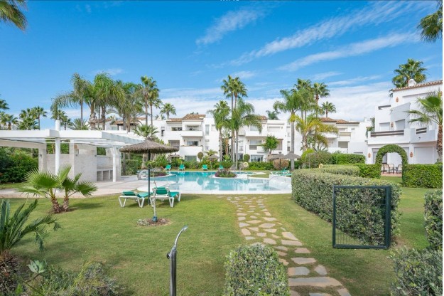 La urbanización ofrece jardines tropicales, piscinas y un entorno cuidado con acceso directo a la playa, en una de las zonas más demandadas entre Estepona y Marbella.