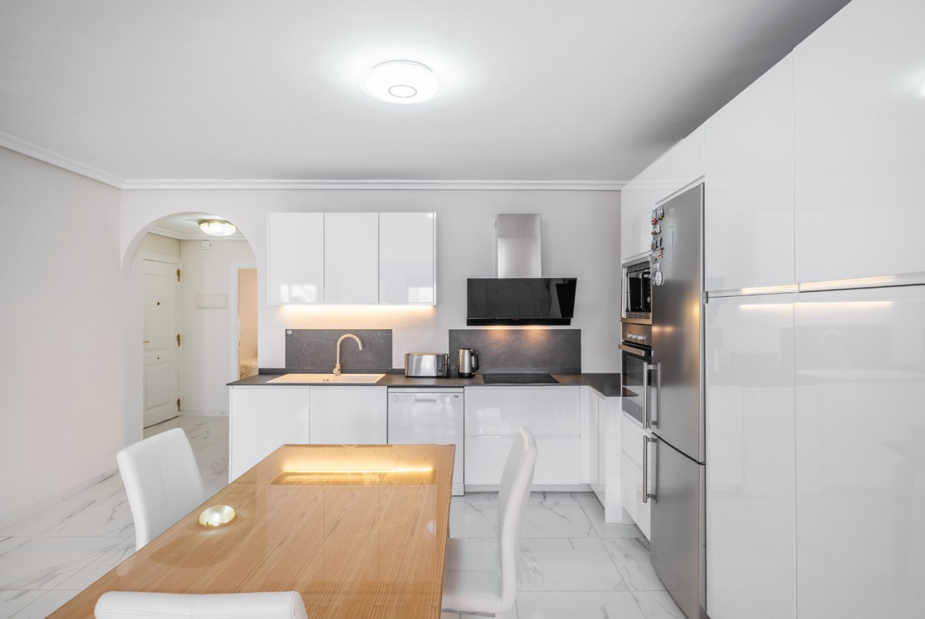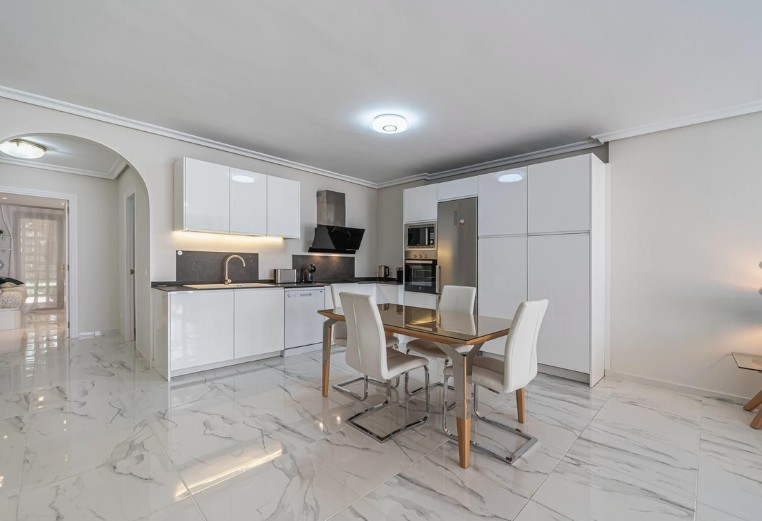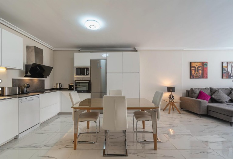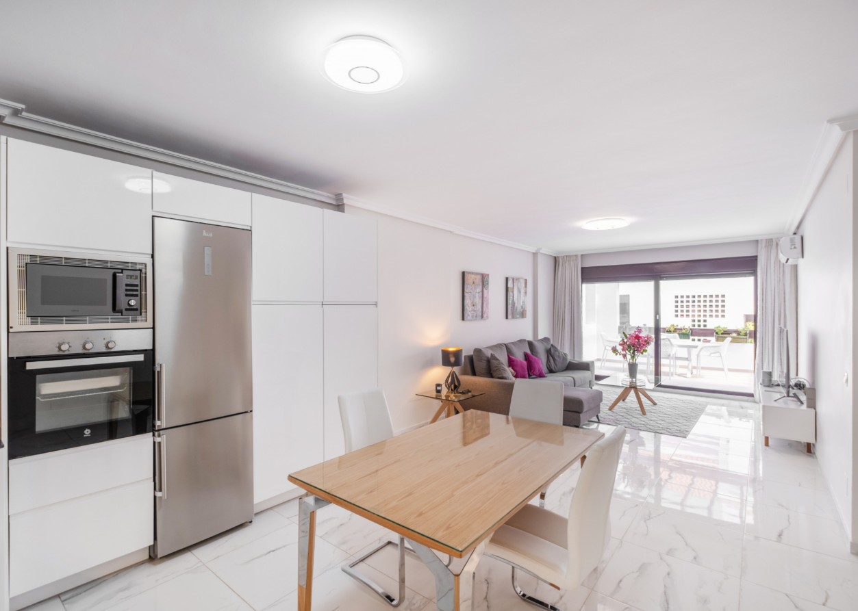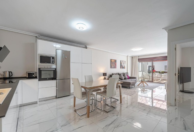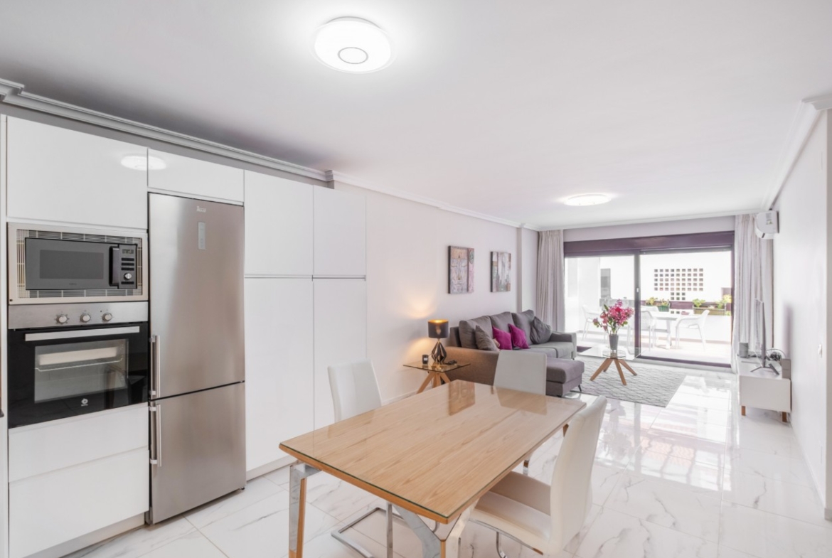 La vivienda consta de tres dormitorios, dos baños, un amplio salón-comedor y una cocina totalmente amueblada, con una distribución funcional y acabados de alta calidad que crean un ambiente moderno y acogedor.